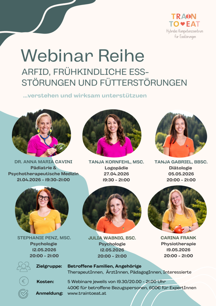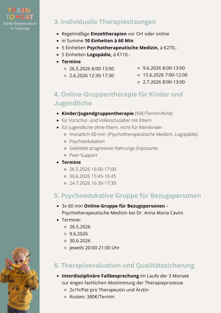 Für alle weiteren fachlichen/organisatorischen Fragen rund um Train to eat bieten wir Ihnen die Möglichkeit, einen kostenpflichtigen Beratungstermin mit einer unserer Obfrauen zu buchen: Tanja Kornfehl, MSc (Logopädie /Organisation und Koordination) oder Dr. Anna Maria Cavini (Fachärztin für Kinder- und Jugendheilkunde / Medizinische Leitung)