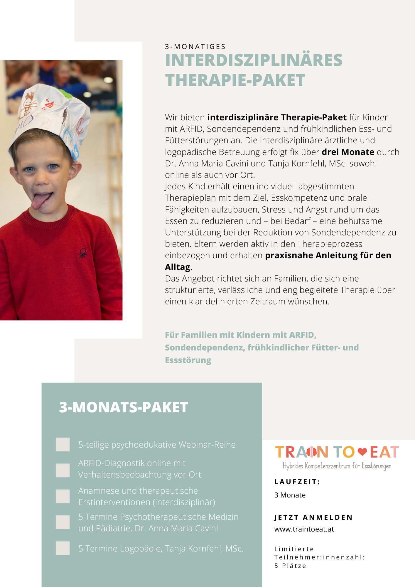 Wir bieten interdisziplinäre Therapie-Paket für Kinder mit ARFID, Sondendependenz und frühkindlichen Ess- und Fütterstörungen an. Die interdisziplinäre ärztliche und logopädische Betreuung erfolgt fix über drei Monate durch Dr. Anna Maria Cavini und Tanja Kornfehl, MSc. sowohl online als auch vor Ort.