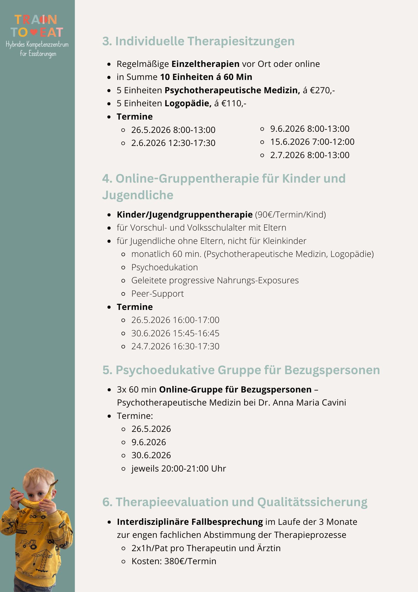 Für alle weiteren fachlichen/organisatorischen Fragen rund um Train to eat bieten wir Ihnen die Möglichkeit, einen kostenpflichtigen Beratungstermin mit einer unserer Obfrauen zu buchen: Tanja Kornfehl, MSc (Logopädie /Organisation und Koordination) oder Dr. Anna Maria Cavini (Fachärztin für Kinder- und Jugendheilkunde / Medizinische Leitung)