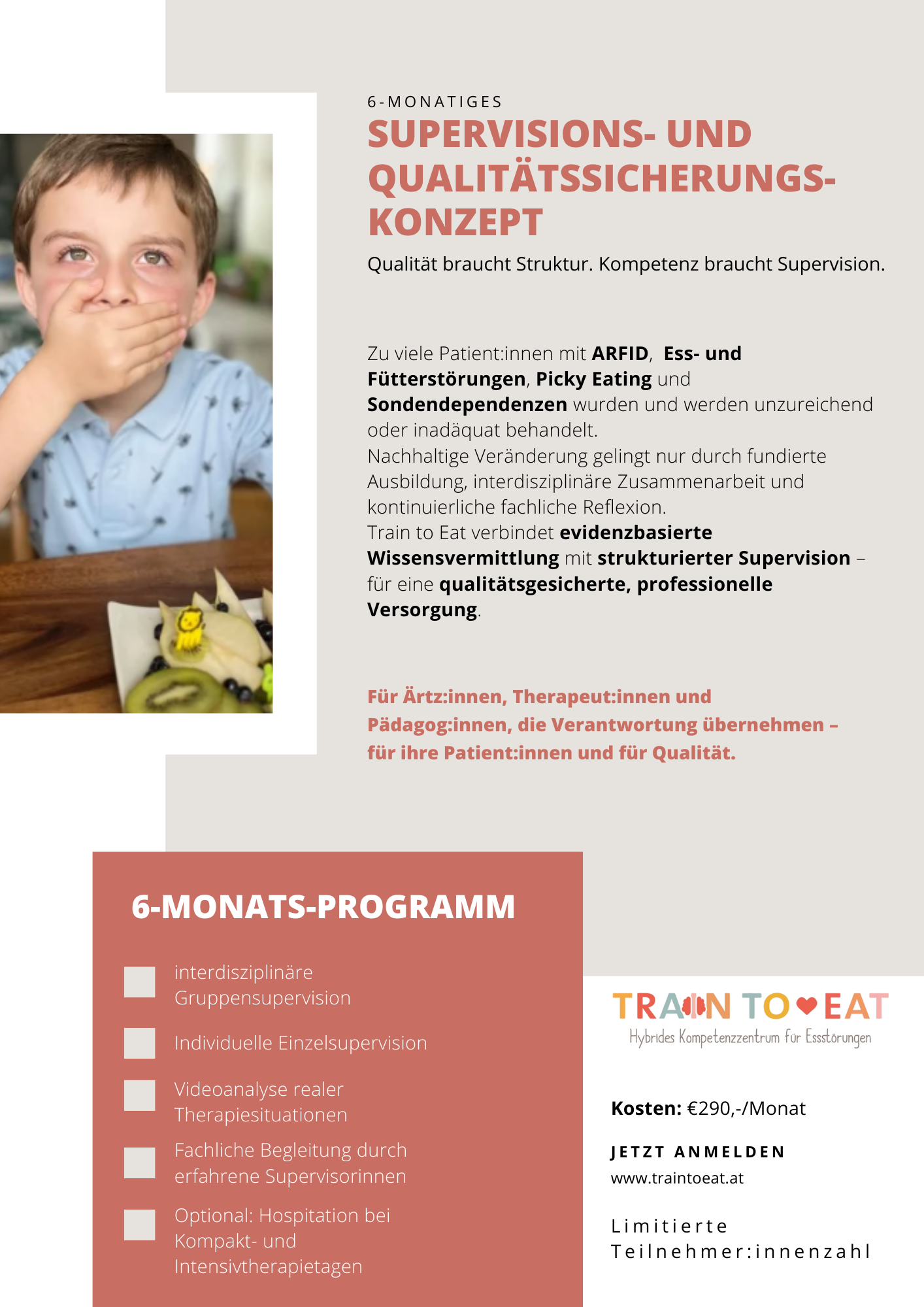 Zu viele Patient:innen mit ARFID, Ess- und Fütterstörungen, Picky Eating und Sondendependenzen wurden und werden unzureichend oder inadäquat behandelt. Nachhaltige Veränderung gelingt nur durch fundierte Ausbildung, interdisziplinäre Zusammenarbeit und kontinuierliche fachliche Reflexion. Train to Eat verbindet evidenzbasierte Wissensvermittlung mit strukturierter Supervision – für eine qualitätsgesicherte, professionelle Versorgung